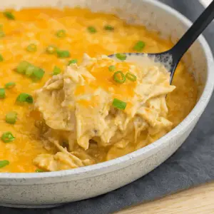 - Fold in the shredded chicken and mix to coat. Sprinkle the remaining cheddar cheese over the top.